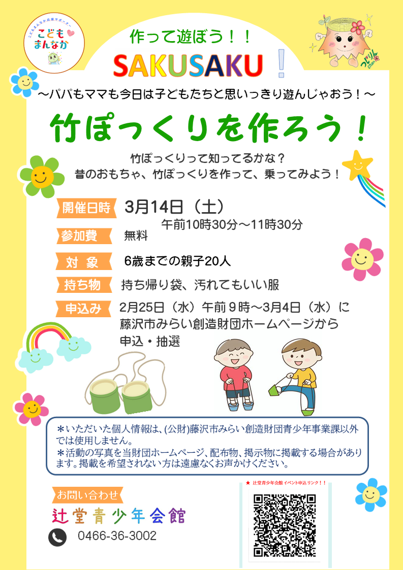 2月25日(水)9時から3月4日 (水)に藤沢市みらい創造財団ホームページの申込システムから申込・抽選(要登録) |